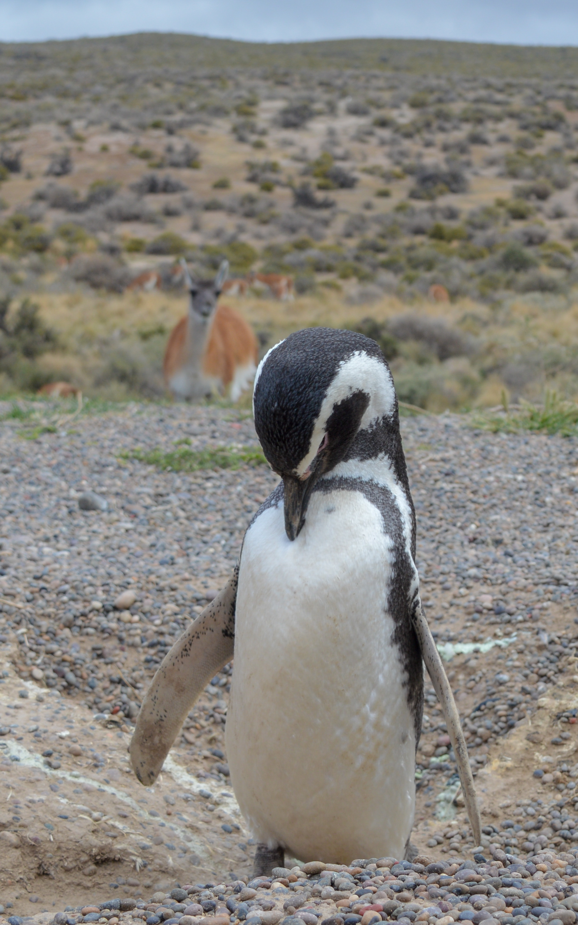 Na de zeeolifanten reden we door naar Punta Tombo, aka Pinguïnland. Hier heb je de grootste kolonie magelhaenpinguïns ter wereld. Je kan ontelbaar veel holen spotten waar de pinguïns hun eitjes uitbroeden en de beestjes waggelen ook zonder schrik de wandelpaden over. Superschattig! Normaal link ik pinguïns ook vooral aan sneeuw en koude, maar hier maken ze hun holen in een steppeachtig landschap waar je ook guanaco’s (een soort lama) kan zien.