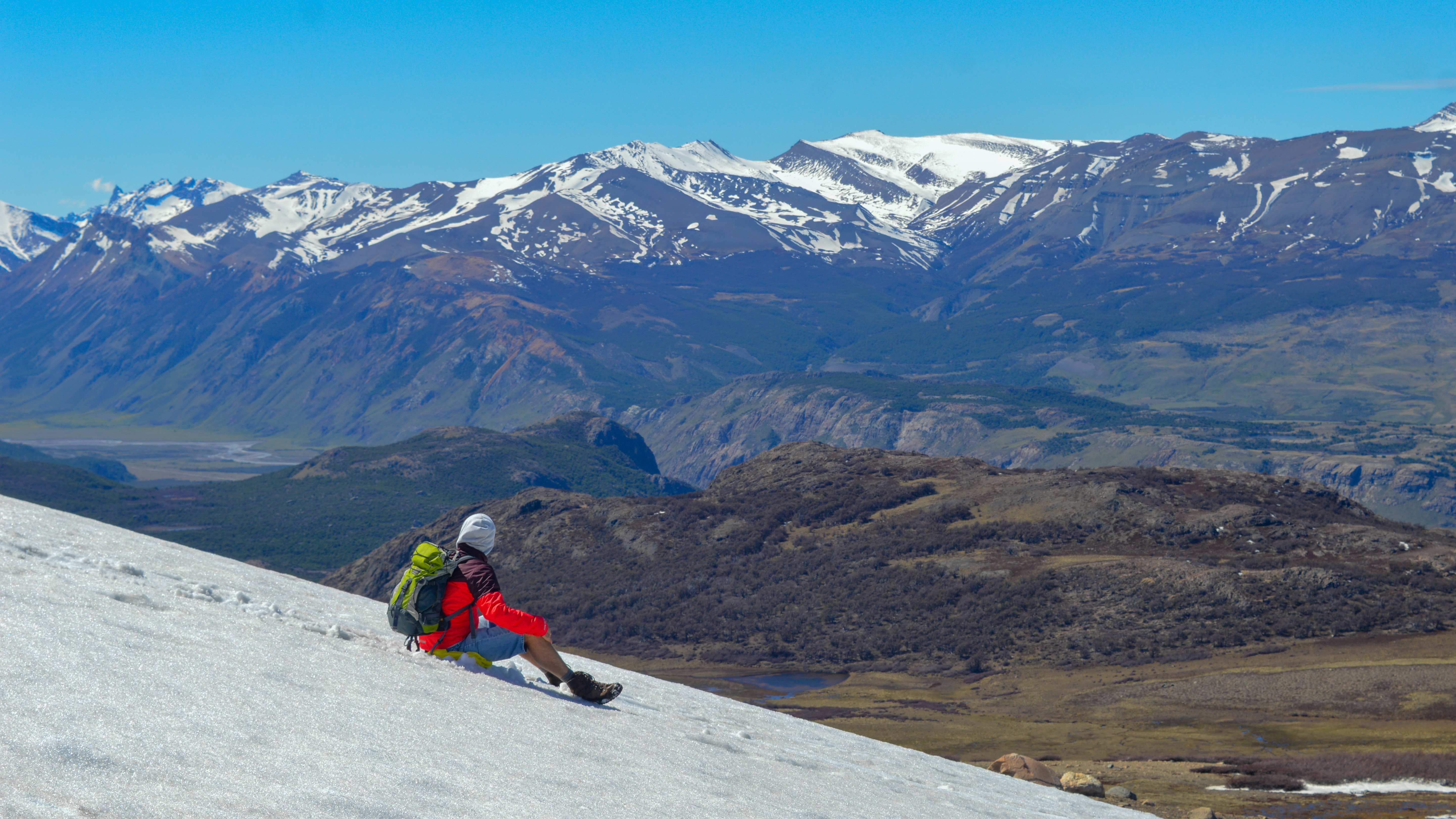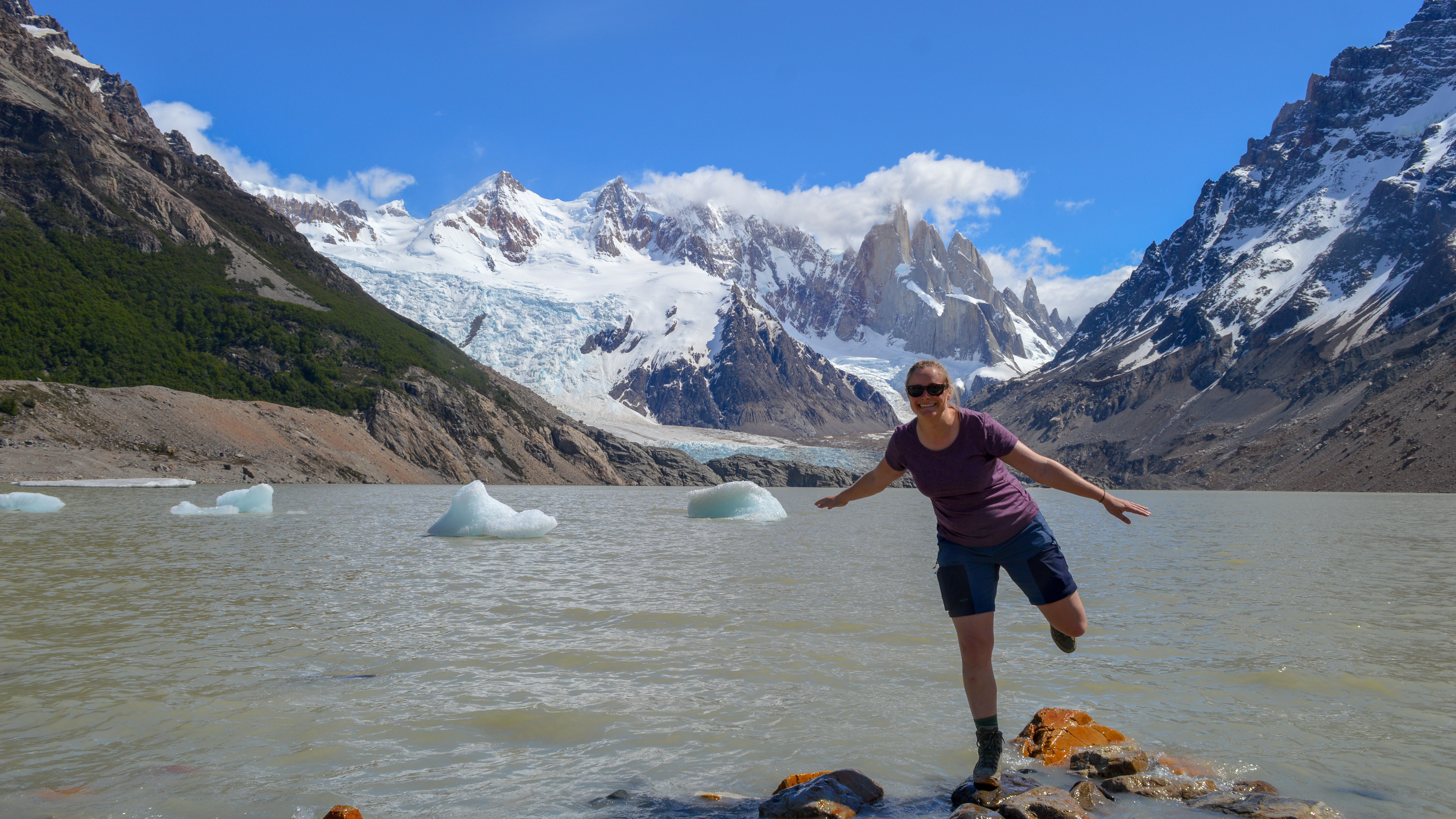 Op onze laatste dag in El Chaltén hadden we met de hele groep de Loma del Pliegue Tumbado wandeling, aka de enige hike vanuit El Chaltén die niet door de vallei trekt. Je gaat een bos door en komt uiteindelijk boven de boomgrens uit om dan nog een stukje te stijgen naar een uitkijkpunt over de Laguna Torre. Hier was het best pittig: er was immers een stuk waar we over bevroren sneeuw moesten. Eens boven stond er een pittig windje waardoor het nogal koud was. Gelukkig hadden we intussen door dat Curcuma superlekkere lunchpakketten aanbiedt en konden we dus genieten van een lekkere wrap & burger in plaats van vies droog brood. De afdaling na de lunch was al even prachtig als de weg omhoog: dezelfde weg in de andere richting doen verveelt hier niet. En klein detail: onze Frits stond ook op dag 3 te blinken in de zon!